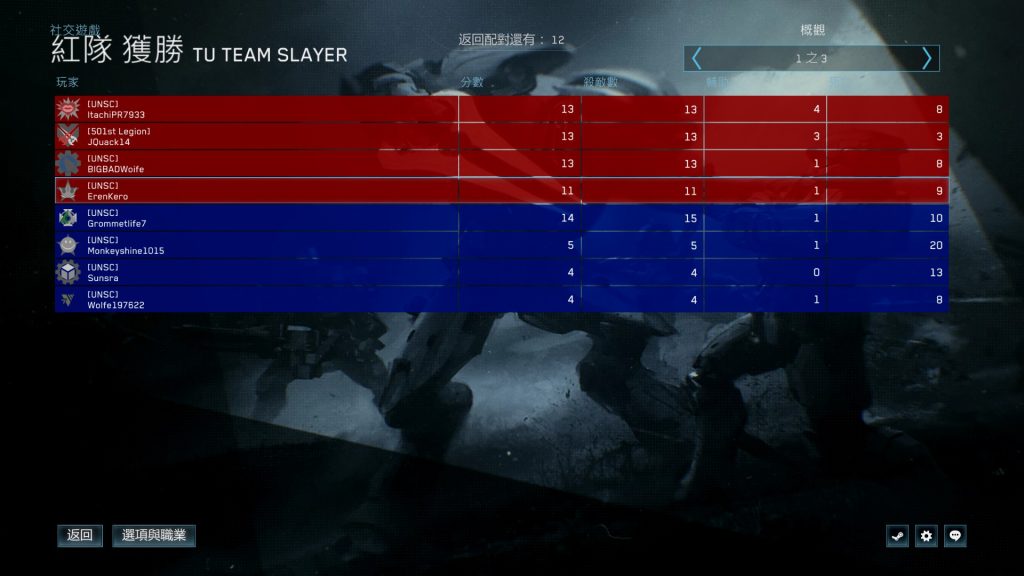 遊戲結束會載入成績頁面,統計數據包含分數、殺敵數、輔助及死亡數等,依個人戰鬥表現,獲得經驗值並晉升軍銜