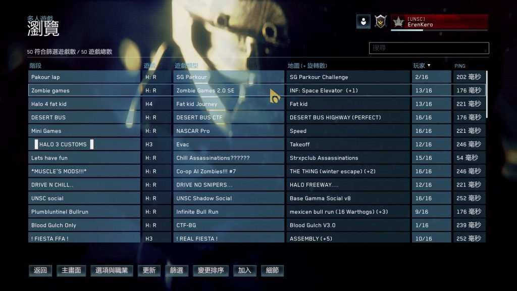 多人遊戲的瀏覽頁面,可以檢視並加入其他玩家創建的伺服器,呈現資訊包含遊戲版本、類型、地圖及玩家數,透過內建的Forge功能,玩家也可以設計專屬的地圖