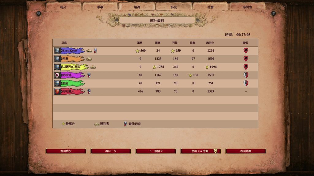 單場遊戲結束後,會進入到統計資料的階段,玩家將依照軍事、經濟、科技、社會等方面的表現,計算所得分數,並且可以參考時間表,了解遊戲中各階段雙方的發展差距