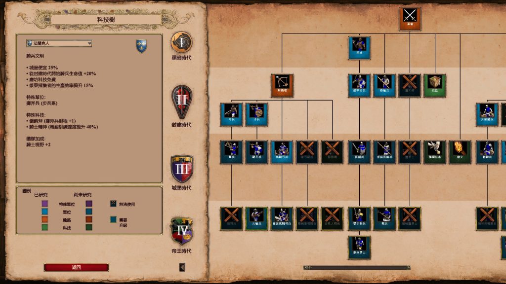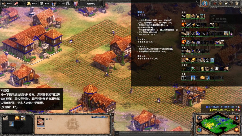 點選我方建築設施後,可以選擇生產單位或研究科技,比如說城鎮中心可以升級文明時代,市集研究銀行制度、修道院研究神聖思想、城堡研究徵兵技術、大學研究建築學,又因為每個文明的科技樹是不同的,各有優劣之處