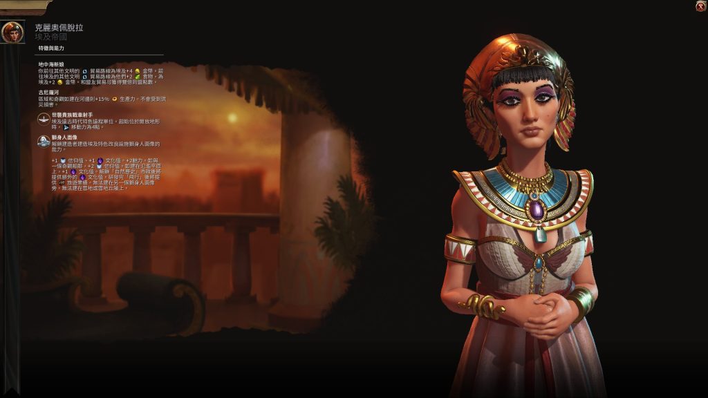 每個文明都有對應的領袖及特色科技,埃及帝國的領袖是克麗奧佩脫拉女王