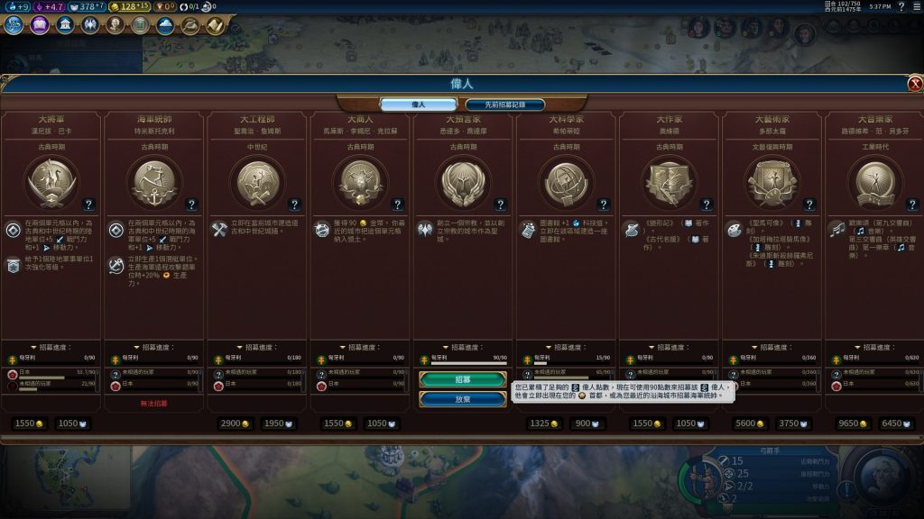 文明發展過程所累積的偉人點數足夠時,就能召募偉人以產生助益
