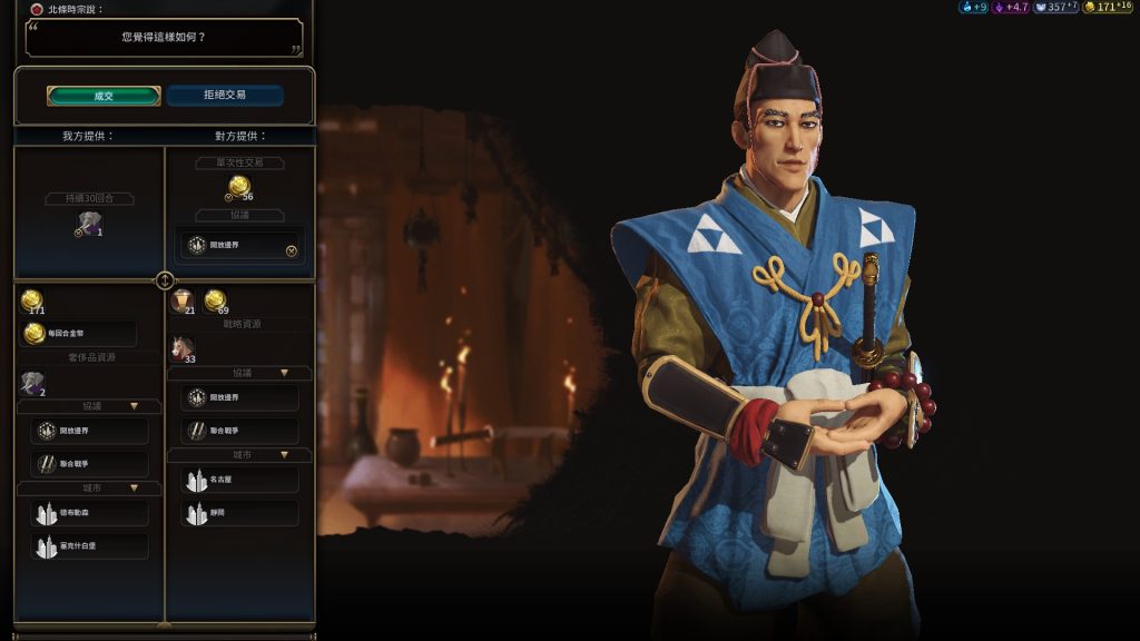 文明領袖之間,可以進行交易,如戰略資源、奢侈品、金錢、外交支持等項目